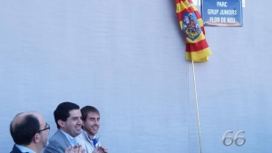 El alcalde de la ciudad, Antonio Francés, junto al director del colegio Sant Roc, Jordi Juan Moltó, y en especial Jorge Sanjuan, uno de los tres responsables del grupo Flor de Neu, han sido los encargados de descubrir la tela en forma de la bandera y el escudo de la ciudad bajo la que estaba oculta la placa con la denominación de este nuevo jardín que cuenta con media pista polideportiva y unas gradas.