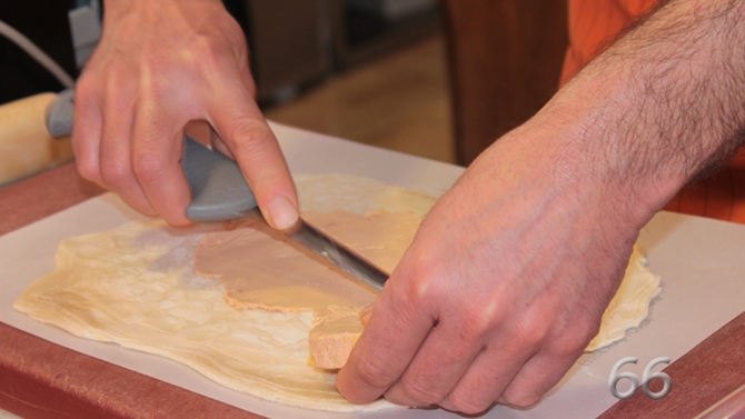 En primer lugar se amasa una pieza de hojaldre para posteriormente untarla con foie. A continuación, se enrolla esa masa con un solomillo de cerdo cocido en su interior. Para que el hojaldre compacte hay que barnizarlo con huevo cocido. El alimento se introduce en el horno durante 25 minutos a 180 grados.