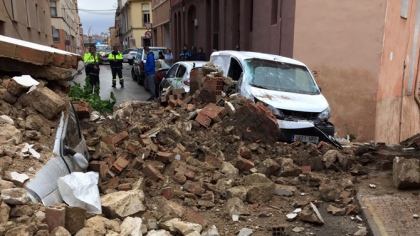 La terraza contigua a un edificio ha caído en la zona del callejón de Balmes, a  la altura de la calle Isabel la Católica. Los vehículos allí aparcados han quedado afectados por los escombros, uno de ellos completamente sepultado.