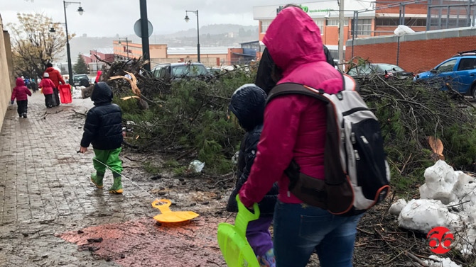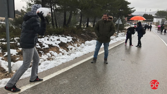 Nieve, la verdad es que poca, pero así son los parques temáticos, todo un poco de mentira. Hay zonas en la provincia con acceso más sencillo y que conservan más nieve, pero la Font Roja de Alcoy es la Font Roja de Alcoy. De todas maneras, una cuneta con tres palmos de nieve es suficiente para deslizarse con la tabla de las olas de la playa y unas bolas al aire se hacen con poco hielo. La cuestión es divertirse y respirar el aire puro de los pinos de la sierra, aunque estén saliendo de cuajo de la tierra por el viento.