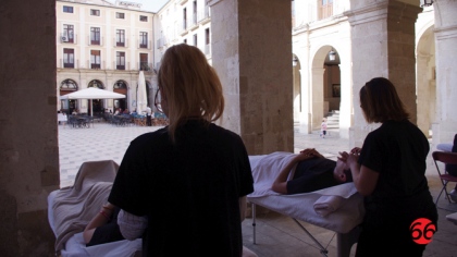 Ha tret de l'Institut els utensilis de treball i ha instal·lat en els arcs d'entrada a la plaça des de Sant Llorenç un parell de lliteres i dos taules on s'han oferit masatges facials i de braços, principalment. Primer han sigut els mateixos alumnes de primer curs el que han donat els massatges i han fet de beneficiaris, però al final algun dels ciutadans que han passat per la zona s'han atrevit a provar-ho.