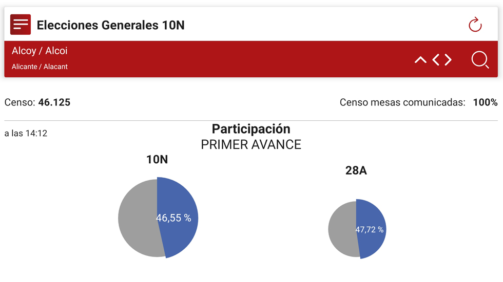 A comparación con las últimas Elecciones Municipales, la participación es mayor, ya que en clave local votaron el 39,50%. Como es habitual, el porcentaje de llamados al voto que ejercen su derecho en unas Elecciones Generales es más alto en Alcoy que la media nacional. Los datos del Ministerio del Interior señalan que el global en España es del 37,93% con el 99,75% de mesas comunicadas.