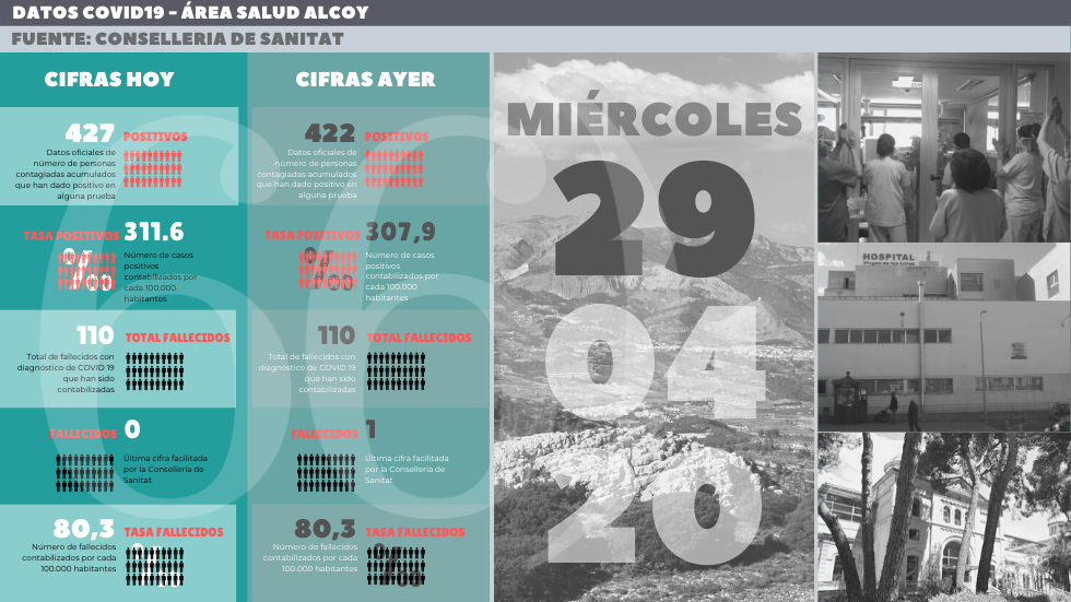 En las últimas 24 horas, el área de Salud de Alcoy no ha registrado ninguna muerte a causa del coronavirus, mientras que el número de positivos nuevos ha sido de 5. La cifra de víctimas mortales se mantiene en 110 y la de contagiados detectados en 427 desde que empezó la pandemia.