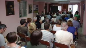 En la fachada del Ayuntamiento ya se puede ver el cartel anunciador de la Romería de la Font Roja. Ha sido descubierto por su autor, Luis Pardo, ante una gran presencia de público, que ha aplaudido la obra.