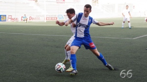 Minuto 62. Joan Vich remata al exterior de la red tras una pared con Francis Ferrón.