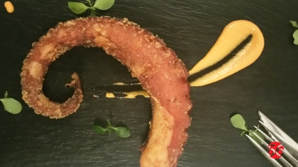 Después, la pareja pescado-carne. Abre el capítulo el pulpo frito a la brasa con all i oli de pimientos del piquillo, crujiente y tierno a la vez, que precede a la brocheta de solomillo y xalota al Oporto a la brasa con salsa de Pedro Ximénez. Después, en el centro, entrecotte al brasa tinchado.