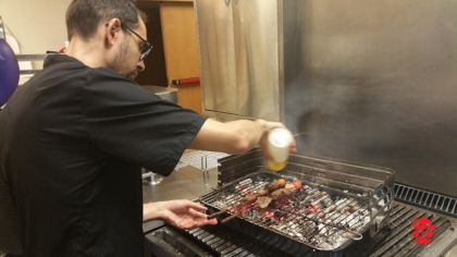 Ya en la recta final del menú de este jueves, primer día de las Jornadas ‘A la brasa’, un granizado de limón a la parrilla que ayuda a digerir cada sabor y de postre, una copa de piña colada con espuma de leche merengada y tierra de coco, que el responsable de la cocina de La Vil·leta, Ever Sevilla prepara justo un segundo antes de su degustación.