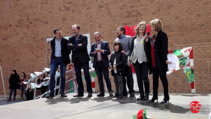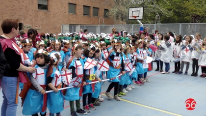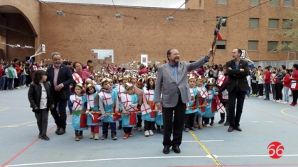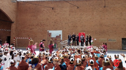 Els dos capitans, José Vicente Jornet pels Navarros i Jordi Vaquer pels Verds, l'alferes de les Tomasines, José Luis Calbo, i el Sant Jordiet Juanjo Valls, han pujat fins al col·legi per a formar part d'aquesta Festa de Moros i Cristians tan particular del col·legi.
