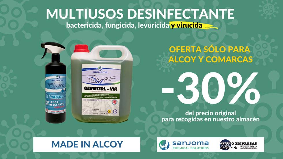 Una de ellas es Sanjoma Chemical Solutions, empresa alcoyana que se dedica a fabricar detergentes y biocidas. Ahora acaba de lanzar al mercado un nuevo producto que ayudará a frenar al coronavirus. Se trata de GERMITOL-VIR, un limpiador multiusos desinfectante, bactericida, fungicida, levuricida y virucida.