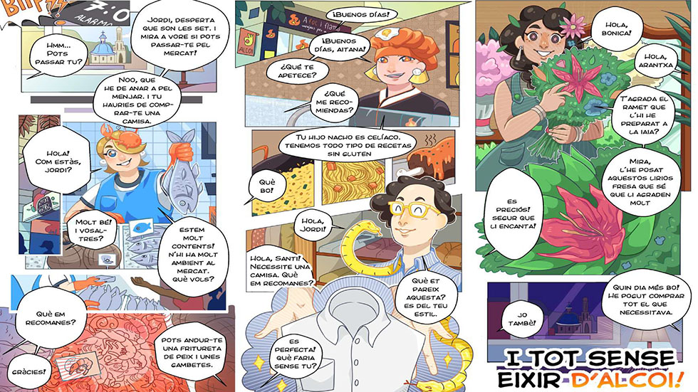 Gracias a la colaboración con la Escuela Superior de Arte y Diseño de Alcoy, los alumnos de ilustración realizaron un cómic basado en la campaña del comercio y en sus dos personajes; Jordi y Aitana. De entre todas las propuestas presentadas, el comité se quedó con el cómic ilustrado de Lucía Varona, estudiante de segundo de Ilustración.
