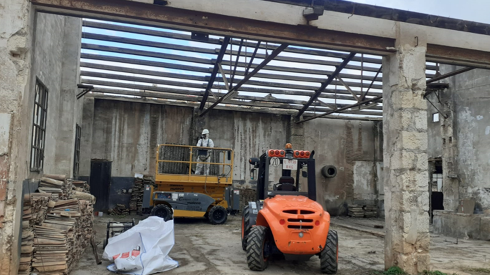 La actuación ha sido encargada a la empresa Esdal S.L, que ha trabajado durante un mes en la retirada de 1.100 m2 de cubiertas y fachadas, y 80 metros de bajantes de asbesto. Una vez finalizada esta actuación, presupuestada en 15.853,49 euros, se retomarán las labores de rehabilitación que está llevando a cabo la UTE de Víctor Tormo y Eladio Silvestre.