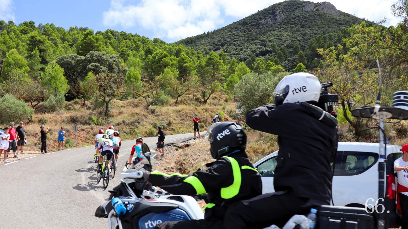 Las motos de los comisarios, las piruetas de los fotógrafos, las cámaras de televisión, los más de 130 guardias civiles con sus casi 60 motocicletas, los coches de los equipos y, como estrellas principales, los dos helicópteros de la tele y el de la Guardia Civil han centrado la atención de quienes han llegado con tiempo a la carretera. Entre refresco y bocata, aplausos a los amateurs que se han acercado a La Vuelta en sus propias monturas y consulta al móvil para ver por dónde iban, ha ido pasando esta mañana, unos entretenidos con el deporte y otros con la esperanza de haber salido en la tele al saludar al helicóptero. Al menos, nuestras montañas y poblaciones sí han salido y seguro que servirá para que en otros lugares nos conozcan mejor.