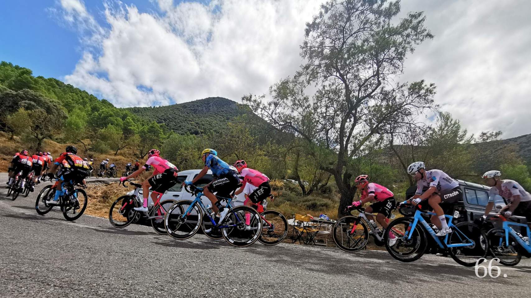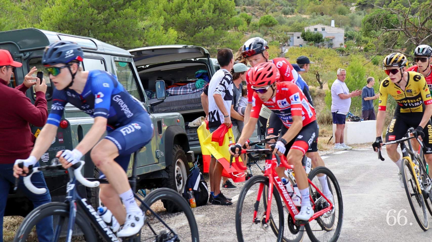 Cuando la prueba ha llegado a nuestras comarcas, el pelotón se había ya disgregado. Desde el descenso del puerto de Tollos hasta poco antes de La Carrasqueta se ha mantenido escapado el belga Thomas De Gendt, del equipo Lotto. Detrás, en el grupo perseguidor, han estado hombres como Antonio Tiberi, Cristian Rodríguez o Jasha Sütterlin. De esta manera, quienes han esperado en las curvas y cuestas clave del recorrido han podido tener tiempo para ir descubriendo a cada corredor. Tras otro grupo con ciclistas del Groupama, el equipo del en ese momento líder de la prueba, ha llegado el grueso de corredores, con la malla roja de la que se ha despedido en esta etapa, el joven francés, Lenny Martínez. Y como todo esfuerzo tiene valor, señalamos que el último, al menos en la subida al puerto de Benifallim, ha sido el también francés del Total Energies, Pierre Latour. El vencedor en el Xorret de Catí el primero ha sido el corredor eslovaco del Jumbo Primož Roglič y su compañero, el estadounidense Sepp Kuss se ha enfundado la camiseta roja de líder, al sacarle un minuto a su propietario anterior.