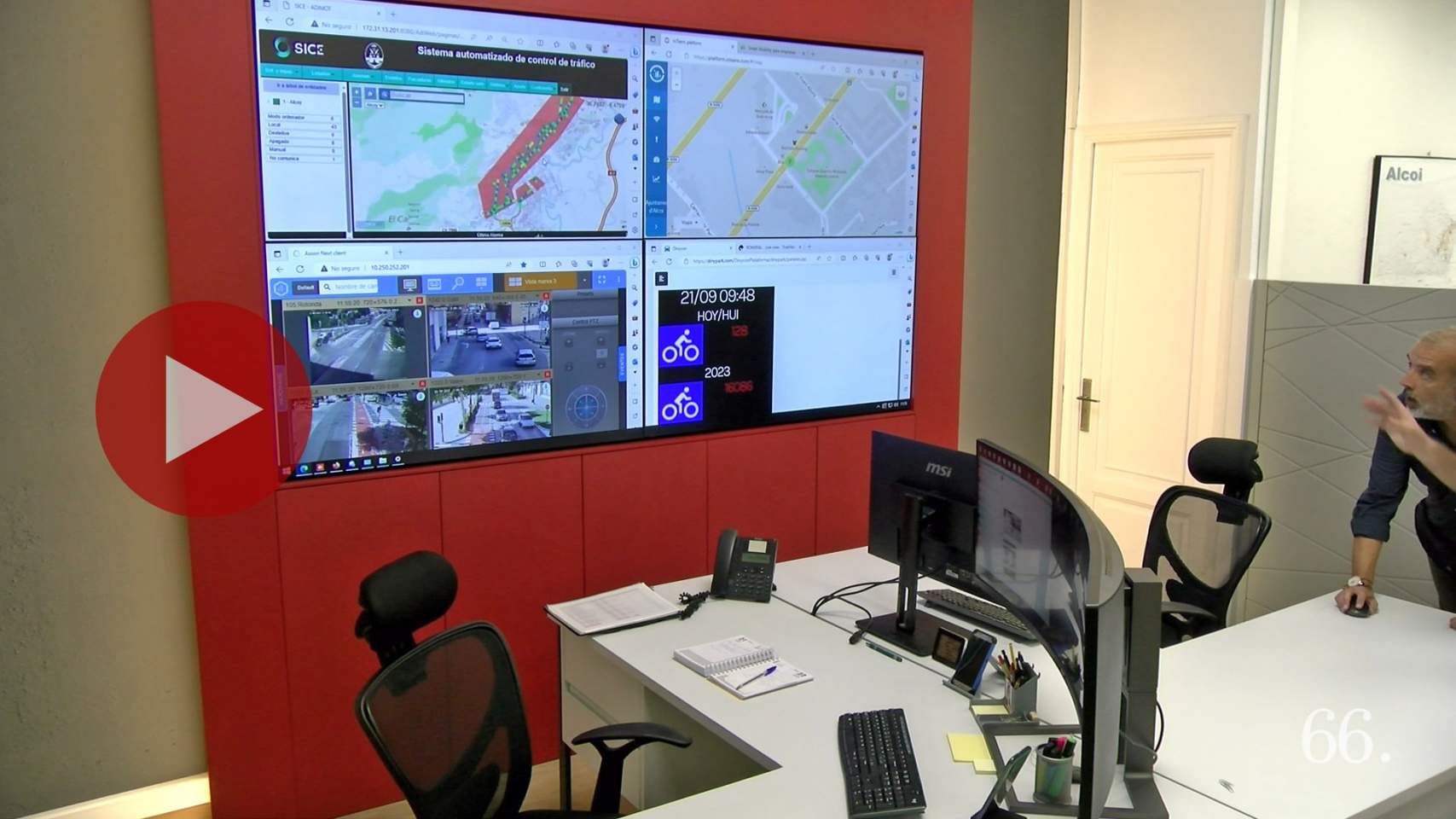 La instalación del sistema permite recoger información a través de sensores dispuestos en 44 cruces semafóricos de la ciudad, cuyos algoritmos dinámicos adaptan la situación demandada por el tráfico en cada momento. Lo explican con detalle en el vídeo el concejal de Movilidad Sostenible, Jordi Martínez; el alcalde de Alcoy, Antonio Francés; y el gerente de Medio Ambiente de la empresa SICE, Francisco Moya.