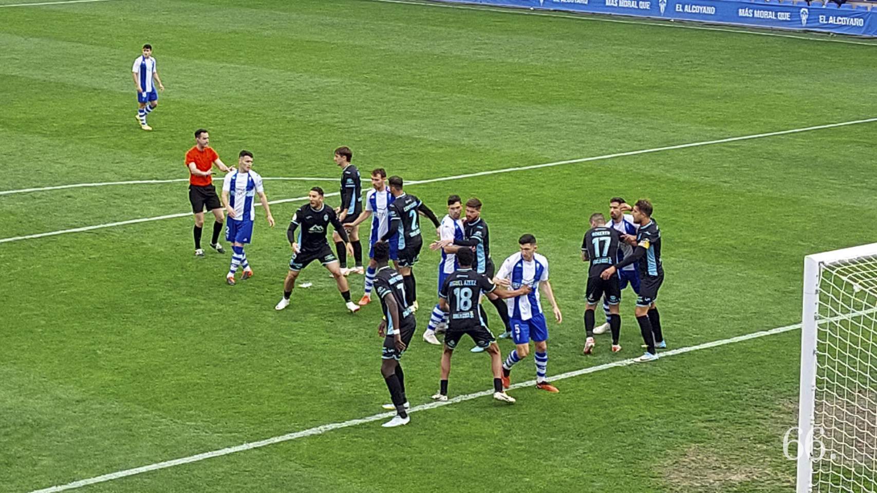 En la jugada siguiente ha tenido el Alcoyano la única reacción de la primera parte para volver a ponerse por delante. Lara ha probado un disparo raso, de falta directa, pero Jero ha despejado con los pies. El balón ha caído a la cabeza de Albisua quien, en su remate, ha estrellado el esférico en Campabadal. Por centímetros se ha escapado fuera lo que hubiera significado autogol del ex alcoyanista.