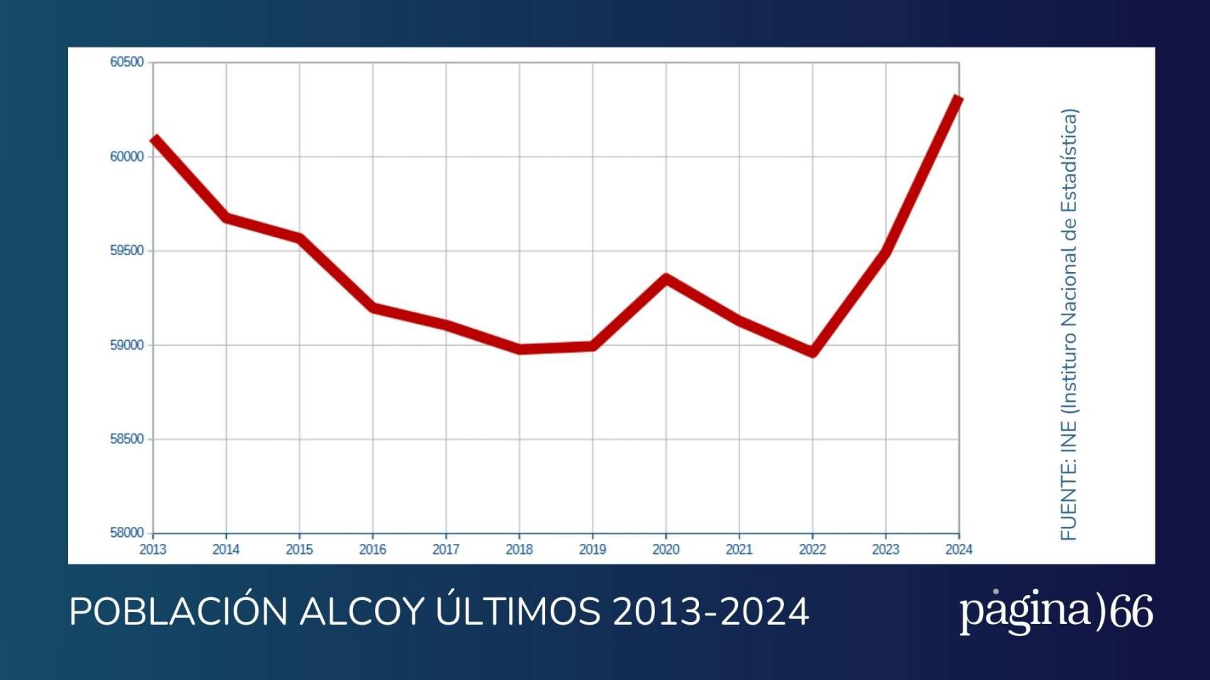 La cifra que propone el INE es la de 60.322 habitantes, 829 más que la oficial de 2023. No alcanzábamos la cifra comenzada en 6 desde el año 2013, como podéis ver en el gráfico. La perdimos en 2014. En ese año éramos 60.105, cuando ya íbamos en caída desde 2009, cuando comenzó la crisis financiera mundial. El número de habitantes de Alcoy continuó decreciendo hasta diez años después, hasta que se produjo cierta estabilización. Nos quedamos en 58.994 y parecía que la tendencia era de subida moderada, pero llegó el covid y la gráfica volvió a experimentar descenso hasta 2022, cuando nos quedamos vivos aquí 58.960. El pasado año la población alcoyana creció hasta los 59.493, superada en este 2024.