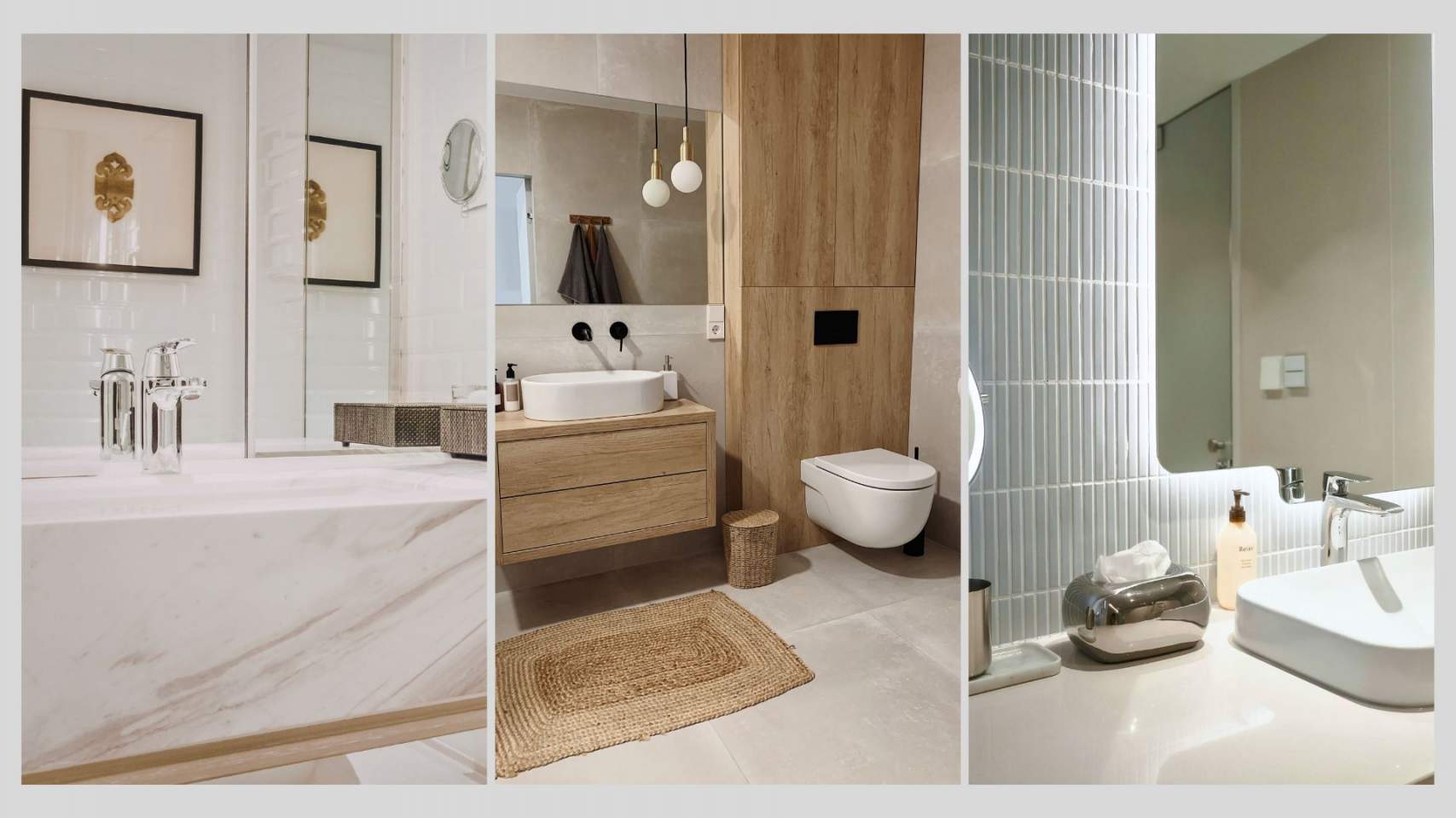 En cuanto a los sanitarios, la elección también influye en la percepción del tamaño. Los sanitarios suspendidos o sin pedestal dejan más espacio visual bajo ellos, lo que da una sensación de ligereza. Lo mismo ocurre con las mamparas de cristal transparente en lugar de cortinas opacas o mamparas con texturas: un panel de vidrio sin marco sólido permite que la vista no encuentre barreras, haciendo que el baño se sienta continuo y más amplio.