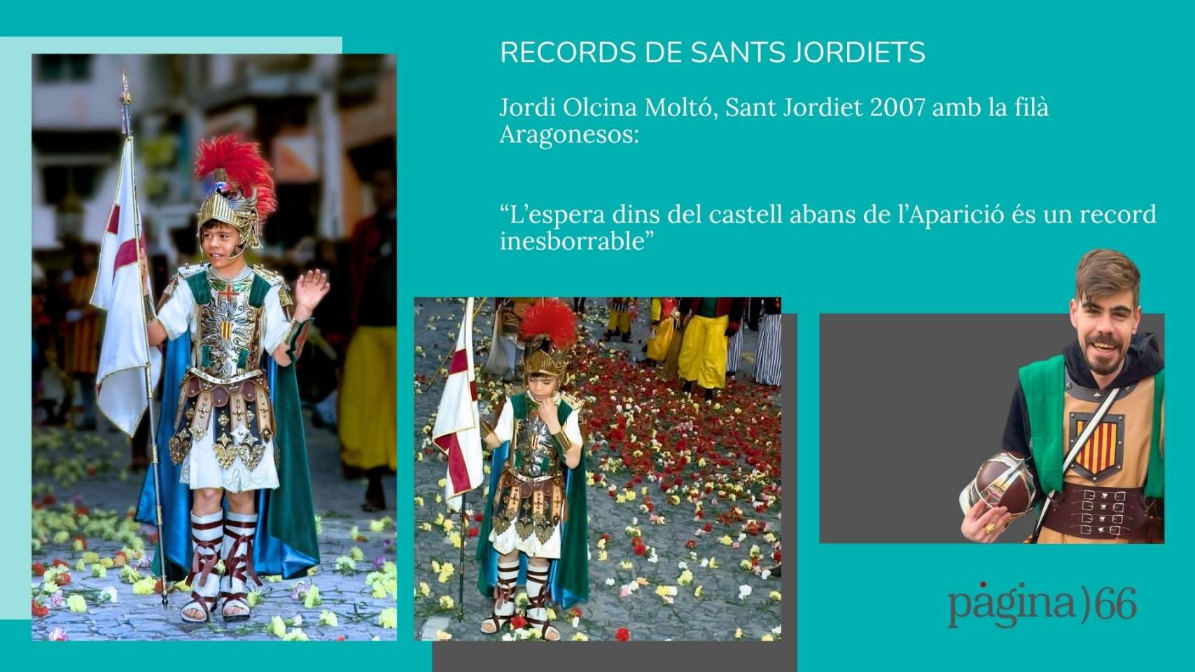Ser Sant Jordiet és tot un camí i Jordi ho resumeix amb una successió d’imatges que encara hui li brollen amb facilitat: el Dia dels Músics, donant la batuta a la directora de l’himne des de la grada de l’Ajuntament; el Dia de l’Entrada, acompanyat per aquell cavall blanc; o el matí de Sant Jordi, amb la seua estimada Filà Aragonesos rebent-lo a casa. I, no cal dir-ho, la Processó de la Relíquia, amb els clavells caient del cel com una pluja d’emocions.