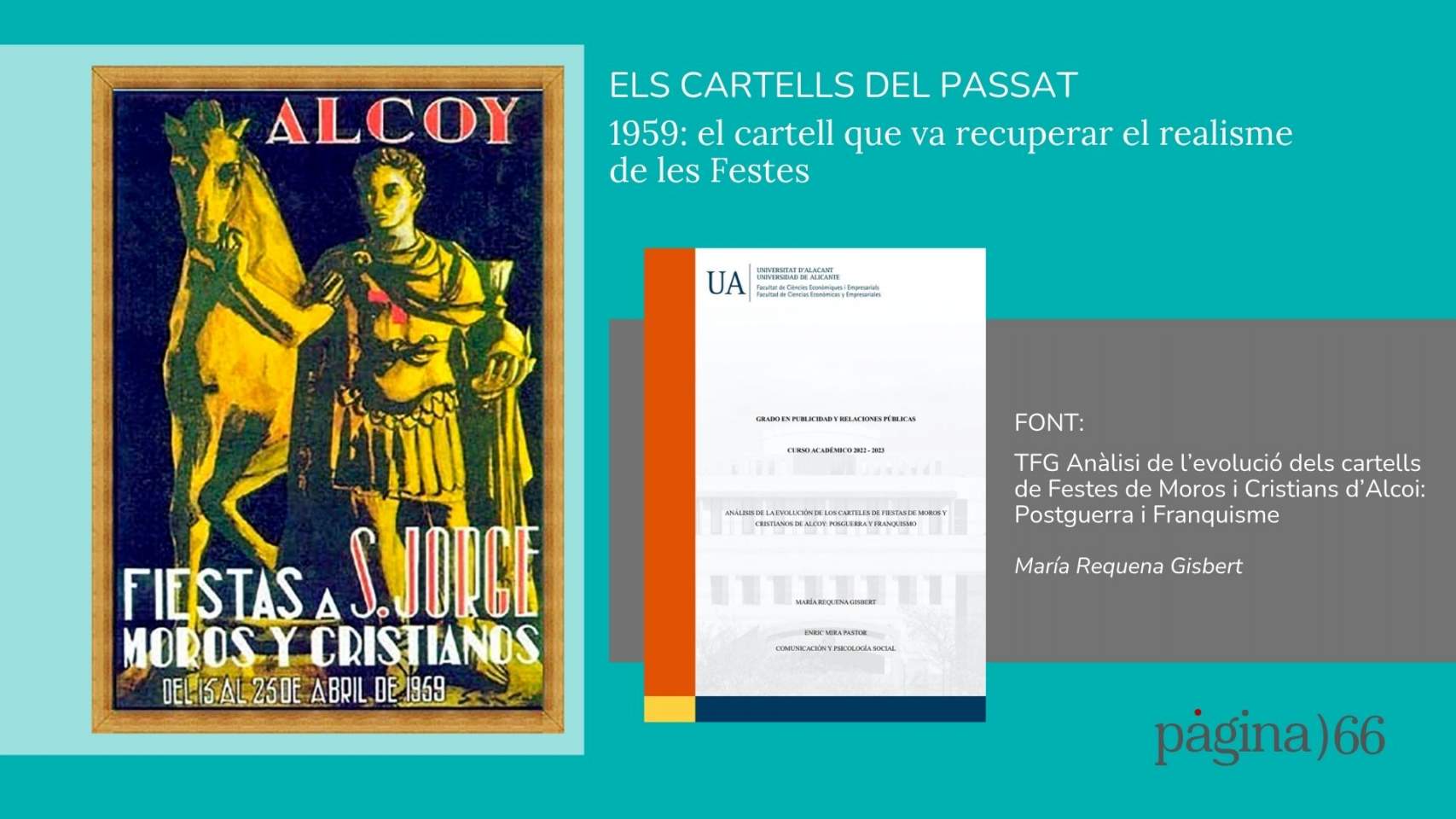 El cartell de les festes de Moros i Cristians d’Alcoi de 1959, obra d’Alfonso Saura Llorens, marca un punt d’inflexió en l’estètica de la cartelleria festera. Després d’uns anys dominats per formes planes i composicions més esquemàtiques, aquesta obra aposta clarament per un retorn al realisme, deixant de costat els colors plans i les figures simplificades dels cartells anteriors.